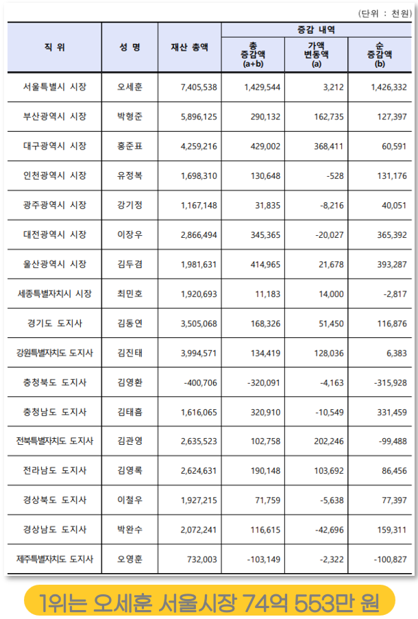 대한민국 수도의 행정 수장인 오세훈 시장은 2025년 기준 74억 553만 원의 재산을 보유하며 광역 자치단체장 중 1위를 차지했다.